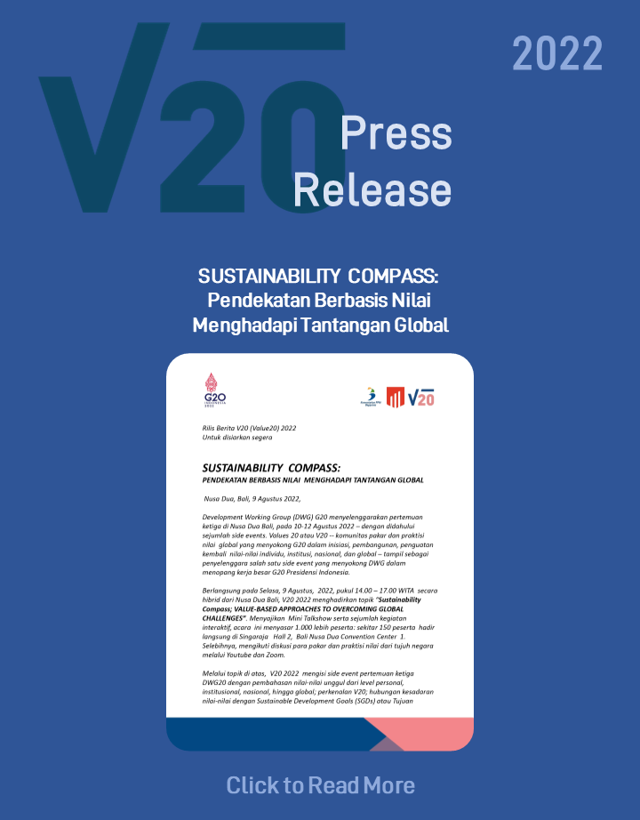 Jakarta, 25 January 2022 - The first V20 Summit was launched in 2020 aimed at deepening understanding of how values can strengthen public policy. V20 is a global community of values experts and practitioners that seek to actively engage with the Group of Twenty...